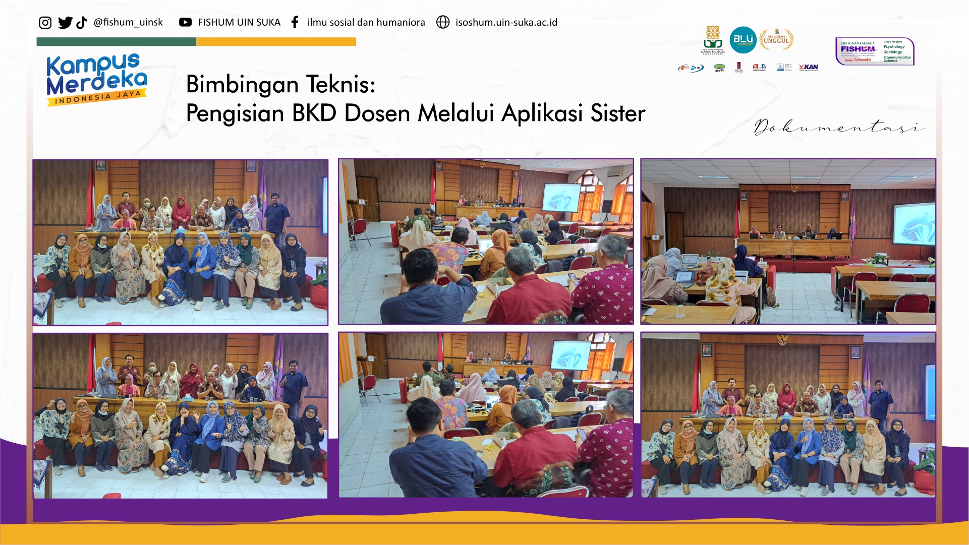 Fakultas Ilmu Sosial dan Humaniora (FISHUM) UIN Sunan Kalijaga Yogyakarta menyelenggarakan acara Bimbingan Teknis: Pengisian BKD Dosen Melalui Aplikasi Sister. Acara ini berlangsung Kamis, 13 Juli 2023, pukul: 13.00 - 15.00 WIB bertempat di Conference Room lt. 1 FISHUM UIN Sunan Kalijaga.